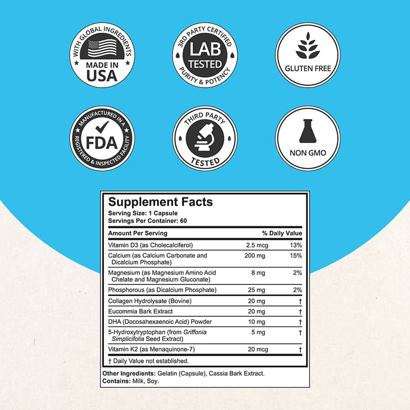 Expertly formulated with Calcium, Collagen, Magnesium, and Phosphorous for bone growth, bone mineral density, immunity, and overall health. Added with Vitamin D3 and Vitamin K2 for enhanced calcium absorption, plus DHA and 5-HTP for healthy brain function.*